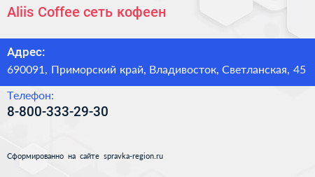 Aliis Coffee, сеть кофеен по адресу 690091, Приморский край, Владивосток, Светланская, 45 в дальнейшем Организация, размещена в следующих категориях: