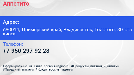 Аппетито по адресу 690014, Приморский край, Владивосток, Толстого, 30 ст5 киоск в дальнейшем Организация, размещена в следующих категориях:
