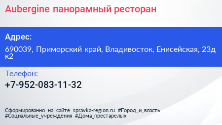 Аubergine, панорамный ресторан по адресу 690039, Приморский край, Владивосток, Енисейская, 23д к2 в дальнейшем Организация, размещена в следующих категориях: