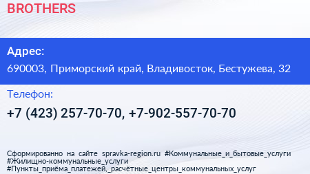 BROTHERS по адресу 690003, Приморский край, Владивосток, Бестужева, 32 в дальнейшем Организация, размещена в следующих категориях: