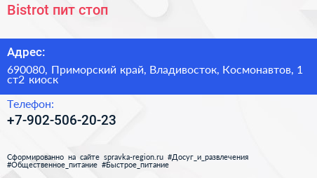 Bistrot, пит-стоп по адресу 690080, Приморский край, Владивосток, Космонавтов, 1 ст2 киоск в дальнейшем Организация, размещена в следующих категориях: