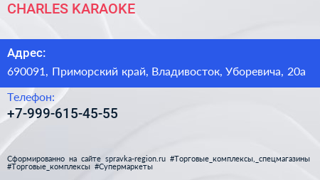 CHARLES KARAOKE по адресу 690091, Приморский край, Владивосток, Уборевича, 20а в дальнейшем Организация, размещена в следующих категориях: