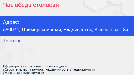 Час обеда, столовая по адресу 690074, Приморский край, Владивосток, Выселковая, 8а в дальнейшем Организация, размещена в следующих категориях:
