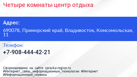 Четыре комнаты, центр отдыха по адресу 690078, Приморский край, Владивосток, Комсомольская, 11 в дальнейшем Организация, размещена в следующих категориях: