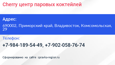 Cherry, центр паровых коктейлей по адресу 690002, Приморский край, Владивосток, Комсомольская, 29 в дальнейшем Организация, размещена в следующих категориях:
