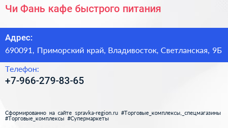 Чи-Фань, кафе быстрого питания по адресу 690091, Приморский край, Владивосток, Светланская, 9Б в дальнейшем Организация, размещена в следующих категориях: