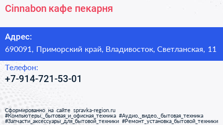 Cinnabon, кафе-пекарня по адресу 690091, Приморский край, Владивосток, Светланская, 11 в дальнейшем Организация, размещена в следующих категориях: