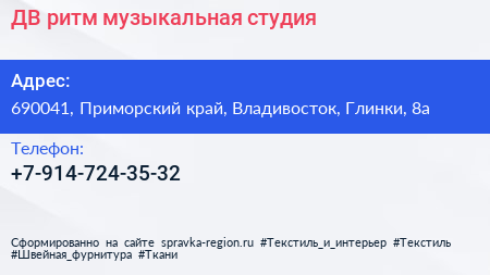 ДВ-ритм, музыкальная студия по адресу 690041, Приморский край, Владивосток, Глинки, 8а в дальнейшем Организация, размещена в следующих категориях: