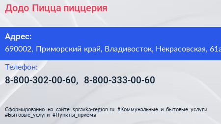 Додо Пицца, пиццерия по адресу 690002, Приморский край, Владивосток, Некрасовская, 61а в дальнейшем Организация, размещена в следующих категориях: