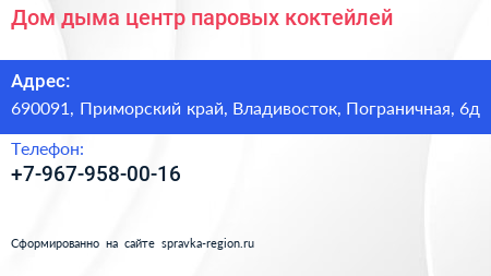 Дом дыма, центр паровых коктейлей по адресу 690091, Приморский край, Владивосток, Пограничная, 6д в дальнейшем Организация, размещена в следующих категориях: