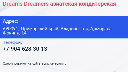 Dreams & Dreamers, азиатская кондитерская по адресу 690091, Приморский край, Владивосток, Адмирала Фокина, 14 в дальнейшем Организация, размещена в следующих категориях: