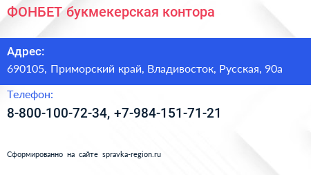 ФОНБЕТ, букмекерская контора по адресу 690105, Приморский край, Владивосток, Русская, 90а в дальнейшем Организация, размещена в следующих категориях: