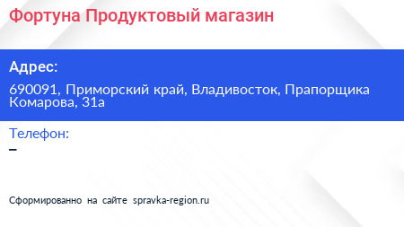 Фортуна, Продуктовый магазин по адресу 690091, Приморский край, Владивосток, Прапорщика Комарова, 31а в дальнейшем Организация, размещена в следующих категориях: