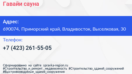 Гавайи, сауна по адресу 690074, Приморский край, Владивосток, Выселковая, 30 в дальнейшем Организация, размещена в следующих категориях: