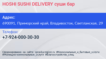 HOSHI SUSHI DELIVERY, суши-бар по адресу 690091, Приморский край, Владивосток, Светланская, 29 в дальнейшем Организация, размещена в следующих категориях: