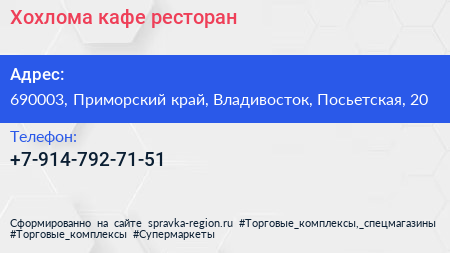 Хохлома, кафе-ресторан по адресу 690003, Приморский край, Владивосток, Посьетская, 20 в дальнейшем Организация, размещена в следующих категориях: