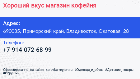 Хороший вкус, магазин-кофейня по адресу 690035, Приморский край, Владивосток, Окатовая, 28 в дальнейшем Организация, размещена в следующих категориях: