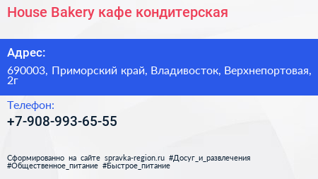 House Bakery, кафе-кондитерская по адресу 690003, Приморский край, Владивосток, Верхнепортовая, 2г в дальнейшем Организация, размещена в следующих категориях: