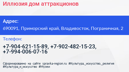 Иллюзия, дом аттракционов по адресу 690091, Приморский край, Владивосток, Пограничная, 2 в дальнейшем Организация, размещена в следующих категориях: