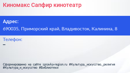 Киномакс-Сапфир, кинотеатр по адресу 690035, Приморский край, Владивосток, Калинина, 8 в дальнейшем Организация, размещена в следующих категориях: