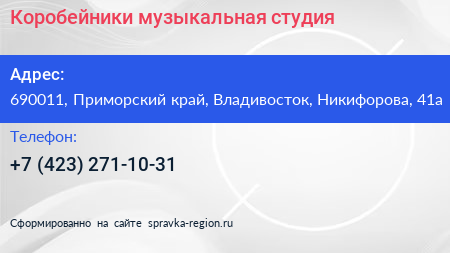 Коробейники, музыкальная студия по адресу 690011, Приморский край, Владивосток, Никифорова, 41а в дальнейшем Организация, размещена в следующих категориях: