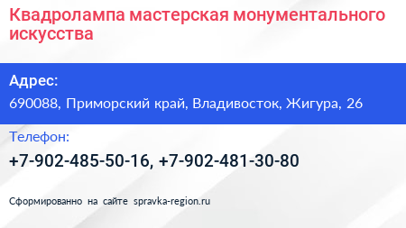 Квадролампа, мастерская монументального искусства по адресу 690088, Приморский край, Владивосток, Жигура, 26 в дальнейшем Организация, размещена в следующих категориях: