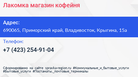 Лакомка, магазин-кофейня по адресу 690065, Приморский край, Владивосток, Крыгина, 15а в дальнейшем Организация, размещена в следующих категориях: