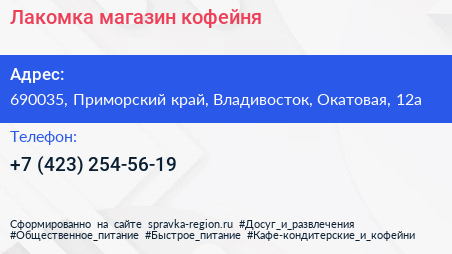 Лакомка, магазин-кофейня по адресу 690035, Приморский край, Владивосток, Окатовая, 12а в дальнейшем Организация, размещена в следующих категориях: