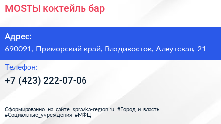 MOSTЫ, коктейль-бар по адресу 690091, Приморский край, Владивосток, Алеутская, 21 в дальнейшем Организация, размещена в следующих категориях:
