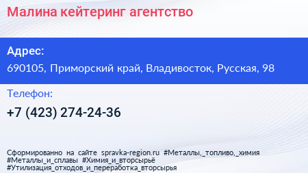 Малина, кейтеринг-агентство по адресу 690105, Приморский край, Владивосток, Русская, 98 в дальнейшем Организация, размещена в следующих категориях: