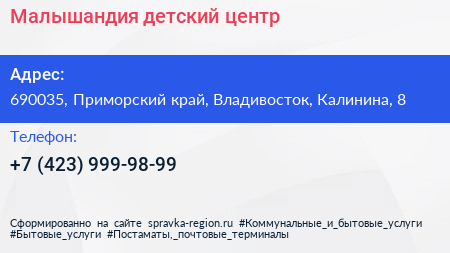 Малышандия, детский центр по адресу 690035, Приморский край, Владивосток, Калинина, 8 в дальнейшем Организация, размещена в следующих категориях: