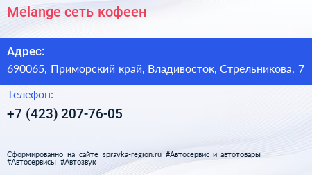 Melange, сеть кофеен по адресу 690065, Приморский край, Владивосток, Стрельникова, 7 в дальнейшем Организация, размещена в следующих категориях:
