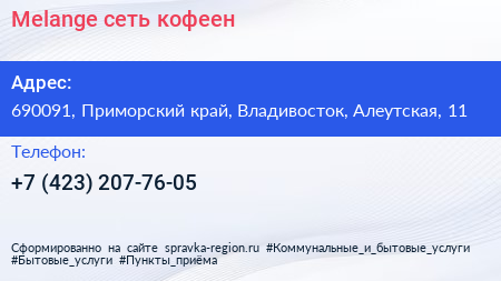 Melange, сеть кофеен по адресу 690091, Приморский край, Владивосток, Алеутская, 11 в дальнейшем Организация, размещена в следующих категориях: