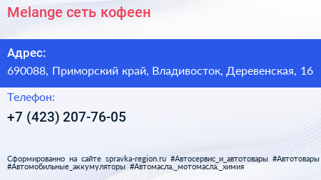 Melange, сеть кофеен по адресу 690088, Приморский край, Владивосток, Деревенская, 16 в дальнейшем Организация, размещена в следующих категориях: