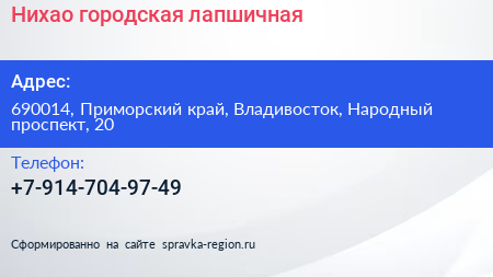 Нихао, городская лапшичная по адресу 690014, Приморский край, Владивосток, Народный проспект, 20 в дальнейшем Организация, размещена в следующих категориях:
