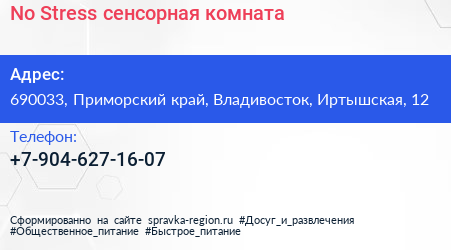 No Stress, сенсорная комната по адресу 690033, Приморский край, Владивосток, Иртышская, 12 в дальнейшем Организация, размещена в следующих категориях: