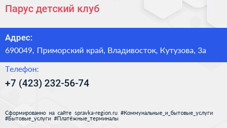 Парус, детский клуб по адресу 690049, Приморский край, Владивосток, Кутузова, 3а в дальнейшем Организация, размещена в следующих категориях: