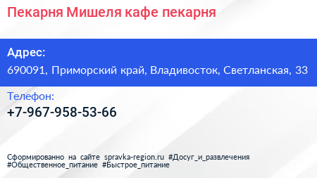 Пекарня Мишеля, кафе-пекарня по адресу 690091, Приморский край, Владивосток, Светланская, 33 в дальнейшем Организация, размещена в следующих категориях: