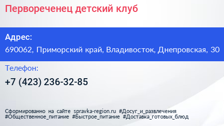 Первореченец, детский клуб по адресу 690062, Приморский край, Владивосток, Днепровская, 30 в дальнейшем Организация, размещена в следующих категориях: