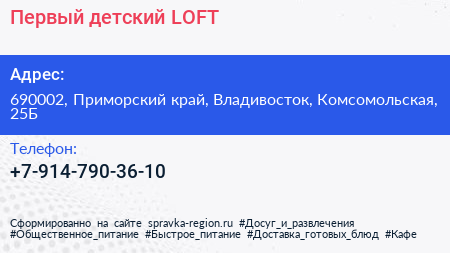 Первый детский LOFT по адресу 690002, Приморский край, Владивосток, Комсомольская, 25Б в дальнейшем Организация, размещена в следующих категориях: