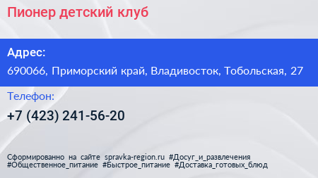 Пионер, детский клуб по адресу 690066, Приморский край, Владивосток, Тобольская, 27 в дальнейшем Организация, размещена в следующих категориях: