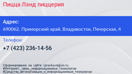 Пицца Лэнд, пиццерия по адресу 690062, Приморский край, Владивосток, Печорская, 4 в дальнейшем Организация, размещена в следующих категориях: