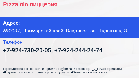 Pizzaiolo, пиццерия по адресу 690037, Приморский край, Владивосток, Ладыгина, 3 в дальнейшем Организация, размещена в следующих категориях: