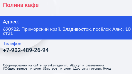 Полина, кафе по адресу 690922, Приморский край, Владивосток, посёлок Аякс, 10 ст21 в дальнейшем Организация, размещена в следующих категориях: