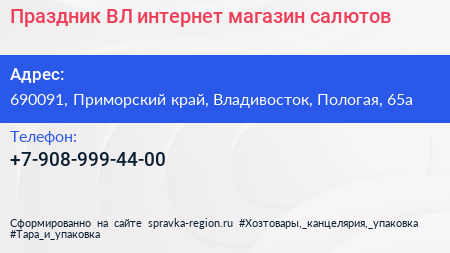 Праздник ВЛ, интернет-магазин салютов по адресу 690091, Приморский край, Владивосток, Пологая, 65а в дальнейшем Организация, размещена в следующих категориях: