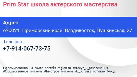 Prim Star, школа актерского мастерства по адресу 690091, Приморский край, Владивосток, Пушкинская, 27 в дальнейшем Организация, размещена в следующих категориях: