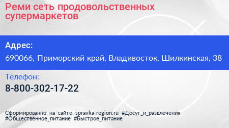 Реми, сеть продовольственных супермаркетов по адресу 690066, Приморский край, Владивосток, Шилкинская, 38 в дальнейшем Организация, размещена в следующих категориях: