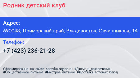 Родник, детский клуб по адресу 690048, Приморский край, Владивосток, Овчинникова, 14 в дальнейшем Организация, размещена в следующих категориях: