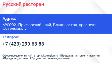 Русский, ресторан по адресу 690002, Приморский край, Владивосток, проспект Острякова, 5г в дальнейшем Организация, размещена в следующих категориях: