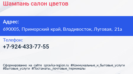 Шампань, салон цветов по адресу 690005, Приморский край, Владивосток, Луговая, 21а в дальнейшем Организация, размещена в следующих категориях: